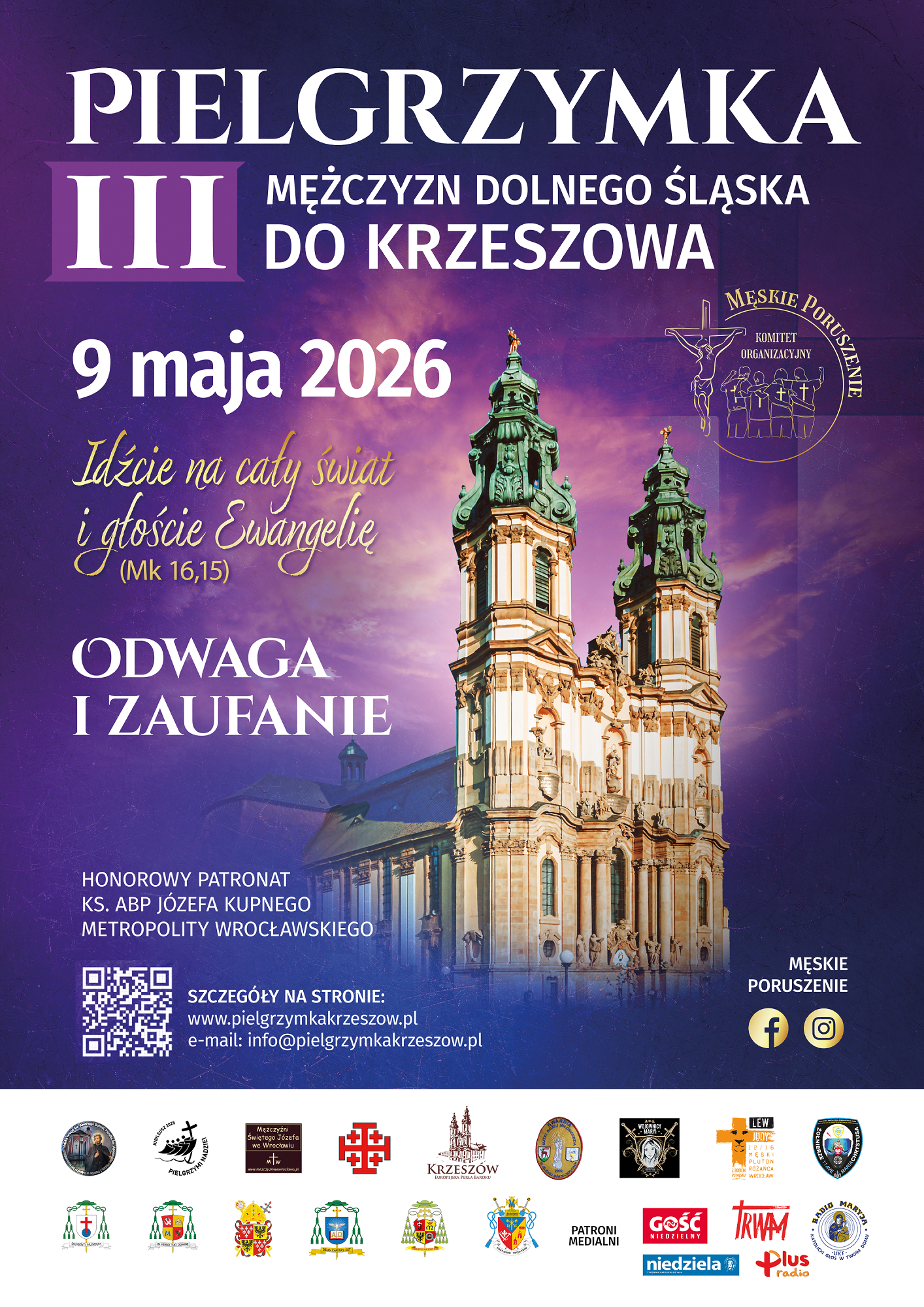 Zapraszamy Was na III. Pielgrzymkę Mężczyzn Dolnego Śląska do Krzeszowa, która odbędzie się 9 maja 2026. Zapiszcie tę datę w swoich kalendarzach, aby wam nie umknęła. I zgłaszajcie się poprzez formularz – to jest dla nas bardzo ważne, abyśmy wiedzieli z wyprzedzeniem, ilu uczestników możemy się spodziewać.